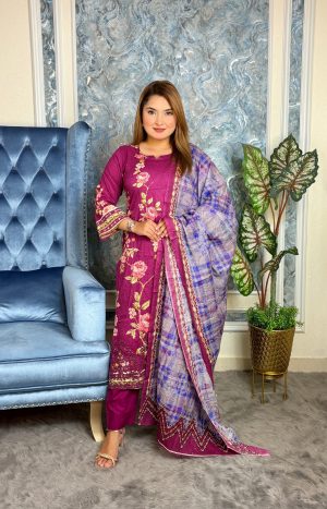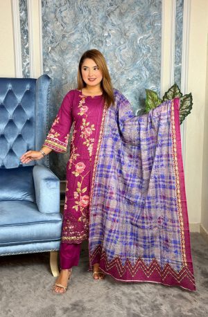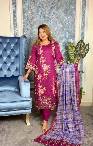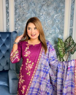 সম্পূর্ণ প্রিমিয়াম কটন এম্বুডারি ও চিকেন কারি কাজের থ্রি-পিস ড্রেস ❤❤ “Super Duper Collection”